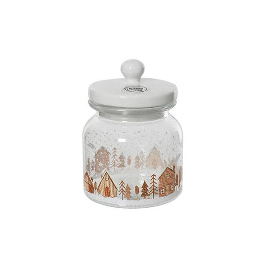 Add this glass storage jar to your kitchen decor and let the fun begin. It features a clear glass jar with a winter scene of brown cabins and trees circling it. You can store some of your favorite items in it, such as cookies or candy. Measures 5.71 inches in height. Food safe. Not safe for microwave or dishwasher use.