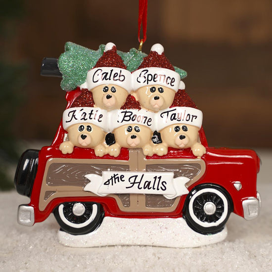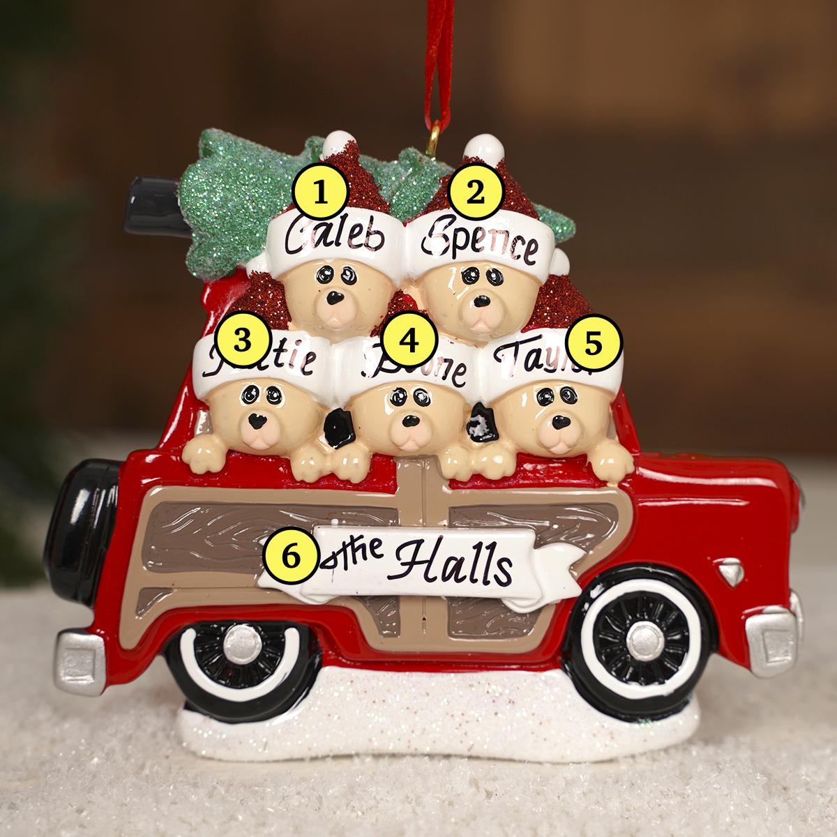 Personalize this ornament with the names of your loved ones. It features a family of 5 bears riding through the country in their old woody wagon. Measures 3.25 inches in height.
