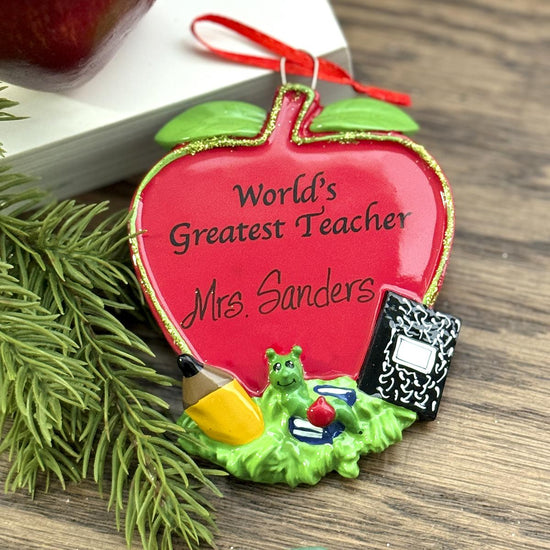 A personalizable ornament of a teacher's red apple with pencil, notepad, green book worm holding a red Christmas ball ornament over a pile of books and is preprinted with "World's Greatest Teacher". Made of quality resin and measures 4in H x 3.25in W x .25in D.