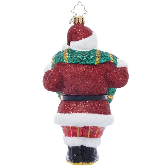 Wreath Wrangler Claus by Christopher Radko features Santa dressed in red and white with a decorated wreath wrapped around him.